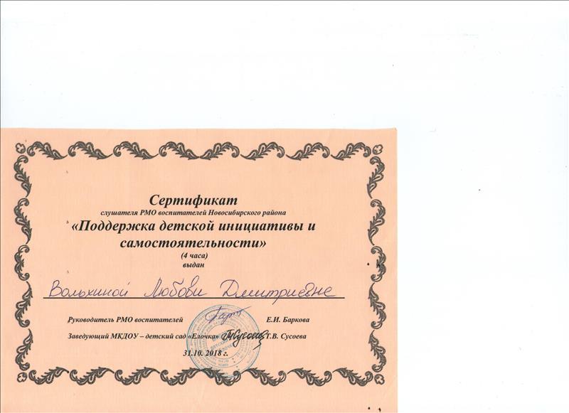 | Сертификат слушателя РМО воспитателей "Поддержка детской инициативы и самостоятельности",2018г. |