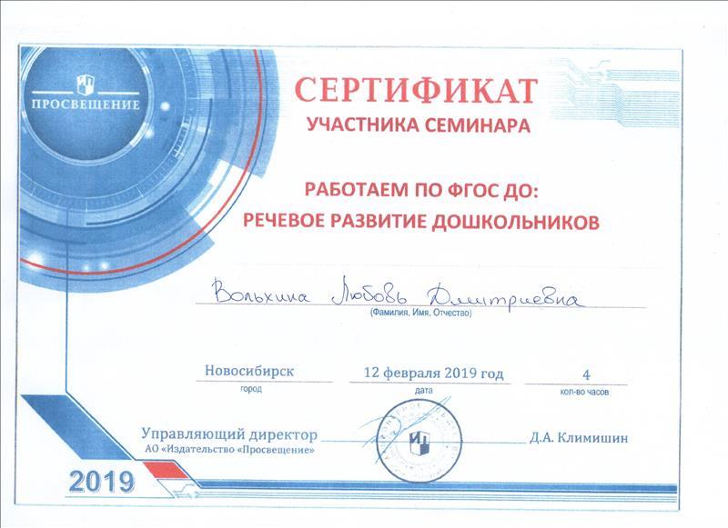 | Сертификат семинара работаем по ФГОС ДО "Речевое развитие дошкольников",2019г. |