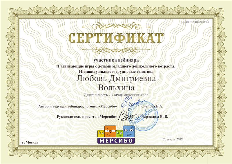 | Сертификат участника вебинара"Развивающие игры с детьми младшего дошкольного возраста. Индивидуальные и групповые занятия",2019г |