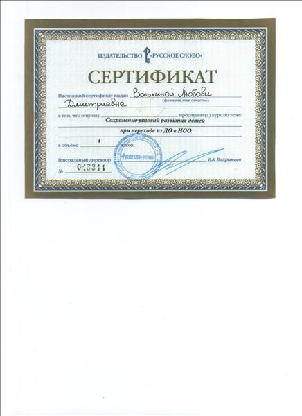 | Сертификат курса по теме "Сохранение условий развития детей при переходе из ДО в НОО", 2019г. |