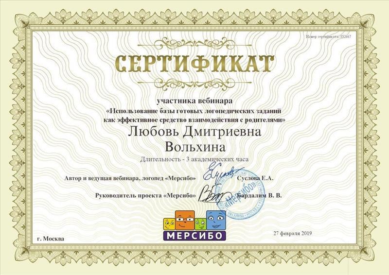 | Сертификат участника вебинара "Использование базы готовых логопедических заданий как эффективное средство взаимодействия с родителями",2019. |