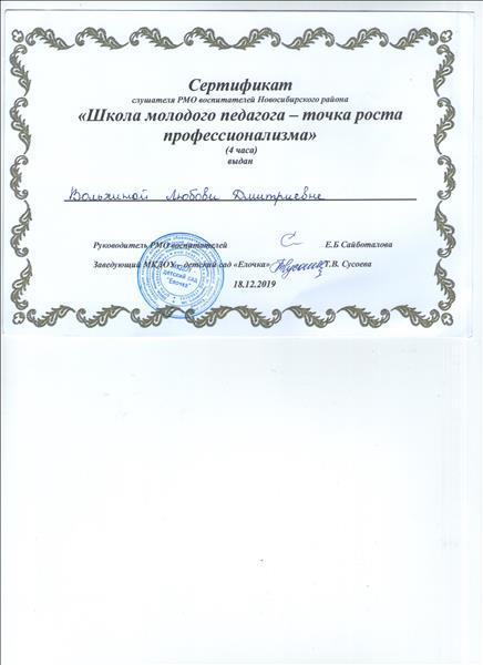 | Сертификат слушателя РМО воспитателей Новосибирского района "Школа молодого педагога - точка роста профессионализма". 2019г. |