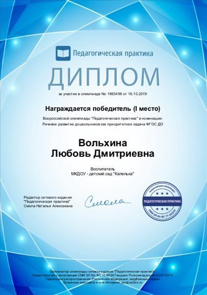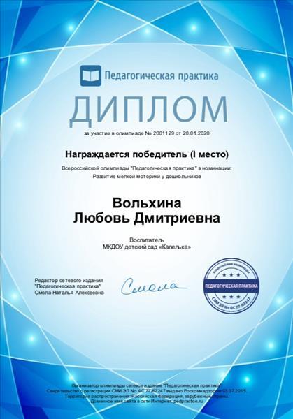 | Диплом 1 место во Всероссийской олимпиаде "Педагогическая практика" номинации "Развитие мелкой моторики у дошкольника" 2020г. |