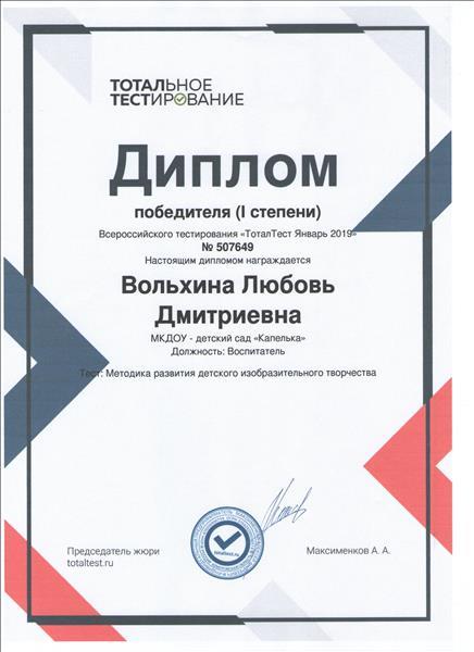 | Диплом I степени Всероссийского тестирования "Методика развития детского изобразительного творчества",2019г. |