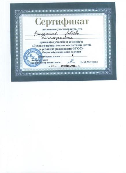 | Сертификат участника семинара "Духовно-нравственное воспитание детей в условиях реализации ФГОС",2019г. |