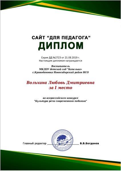 | Диплом за 1 место во всероссийском конкурсе "Культура речи современного педагога",2019г. |