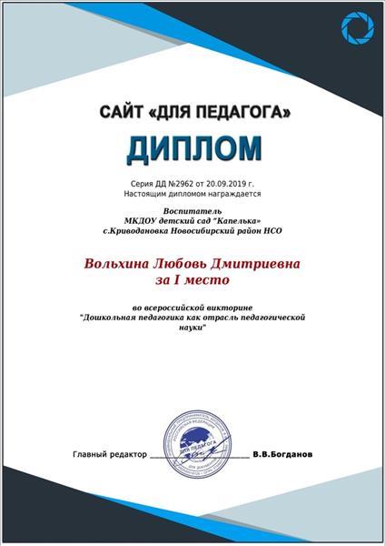 | Диплом за 1 место во всероссийской викторине "Дошкольная педагогика как отрасль педагогической науки",2019г. |