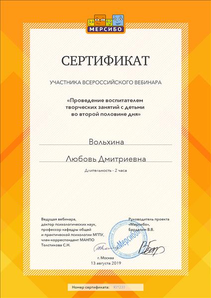 | Сертификат участника всероссийского вебинара "Проведение воспитателем творческих занятий с детьми во второй половине дня",2019г. |