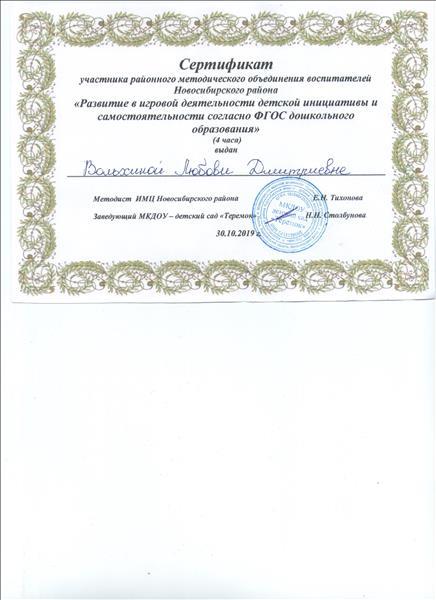 | Сертификат участника районного методического объединения воспитателей Новосибирского района "Развитие в игровой деятельности детской инициативы и самостоятельности согласноФГОС дошкольного образования". 2019г. |