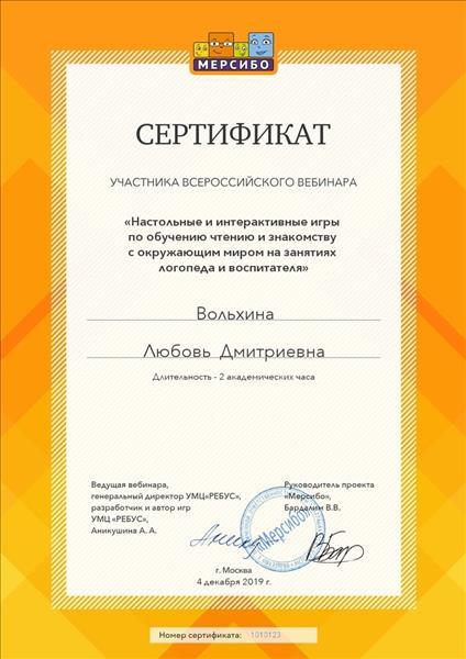 | Сертификат участника Всероссийского вебинара "Настольные и интерактивные игры по обучению чтению и знакомству с окружающим миром на занятиях логопеда и воспитателя",2019г. |