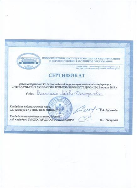 | Сертификат участия в работе IV Всероссийской научно-практической конференции "ОТСМ-РТВ-ТРИЗ В ОБРАЗОВАТЕЛЬНОМ ПРОЦЕССЕ ДОО" 10-12 апреля 2019г. |