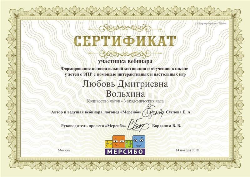| Сертификат участника вебинара "Формирование положительной мотивации к обучению в школе у детей с ЗПР с помощью интерактивных и настольных игр",2018г. |
