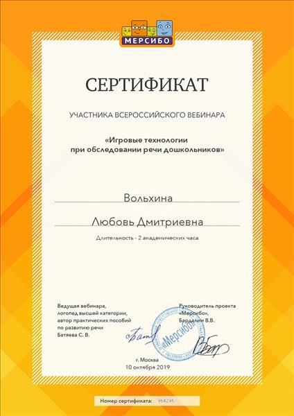 | Сертификат участника всероссийского вебинара "Игровые технологии при обследовании речи дошкольников",2019г. |