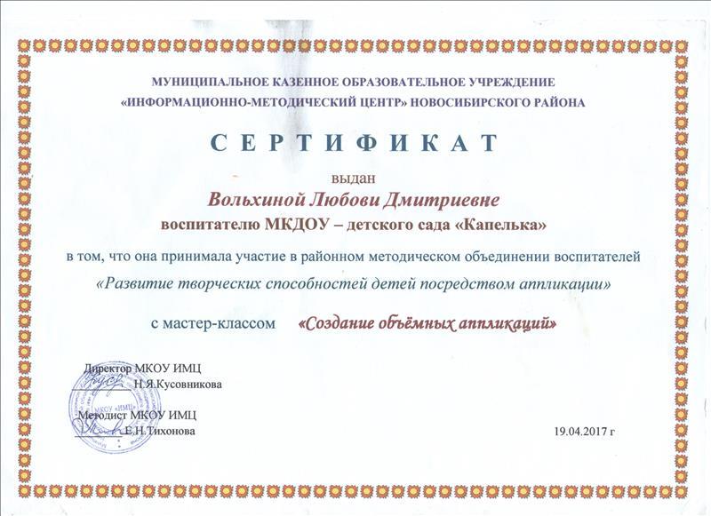 | Сертификат за участие в РМО "Развитие творческих способностей детей посредством аппликации" мастер-класс "Создание объёмных аппликаций",2017г. |