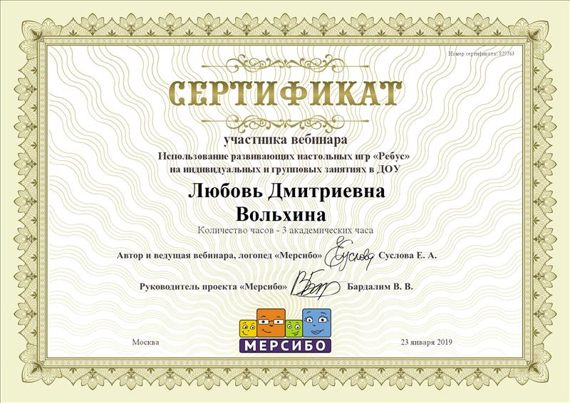 | Сертификат участника вебинара "Использование развивающих настольных игр "Ребус" на индивидуальных и групповых занятиях в ДОУ",2019г. |