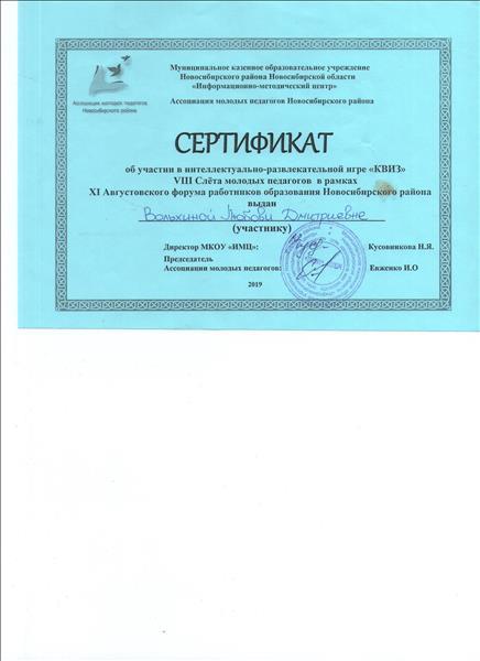 | Сертификат об участии в интелектуально-развлекательной игре "КВИЗ" VIII Слёта молодых педагогов,2019г. |