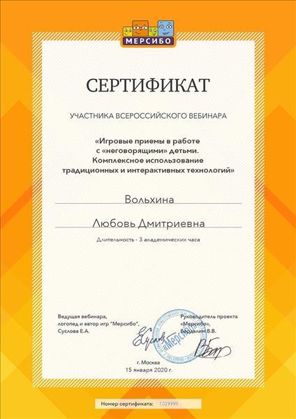 | Сертификат участника Всероссийского вебинара "Игровые приемы в работе с "неговорящими" детьми. 2020г. |