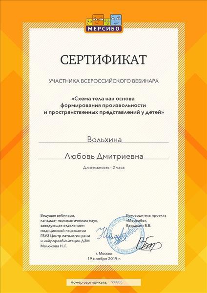 | Сертификат участника Всероссийского вебинара "Схема тела как основа формирования произвольности и пространственных представлений у детей",2019г. |