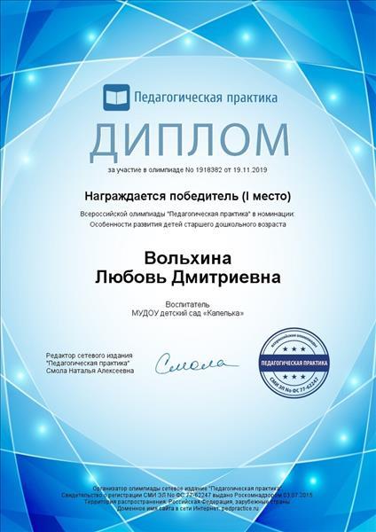 | Диплом 1 место во Всероссийской олимпиаде "Педагогическая практика" в номинации "Особенности развития детей старшего дошкольного возраста",2019г. |