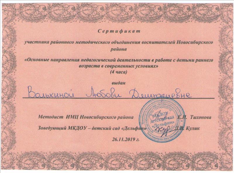 | Сертификат участника районного методического объединения воспитателей Новосибирского района "Основные направления педагогической деятельности в работе с детьми раннего возраста в современных условиях",2019г. |