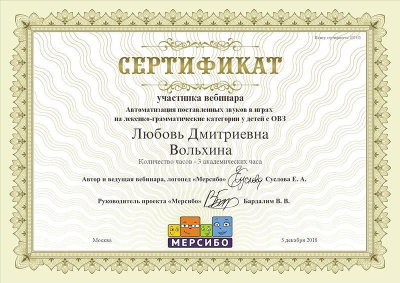 | Сертификат участника вебинара "Автоматицация поставленных звуков в играх на лексико-грамматические категории у детей с ОВЗ",2018г. |