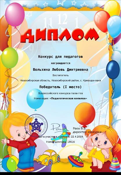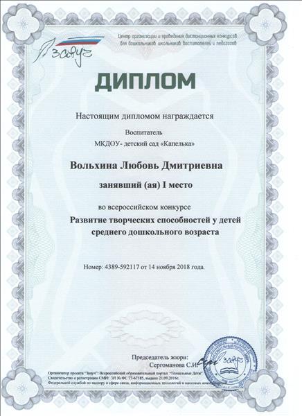 | Диплом 1 место во Всероссийском конкурсе "Развитие творческих способностей у детей среднего дошкольного возраста",2018г. |