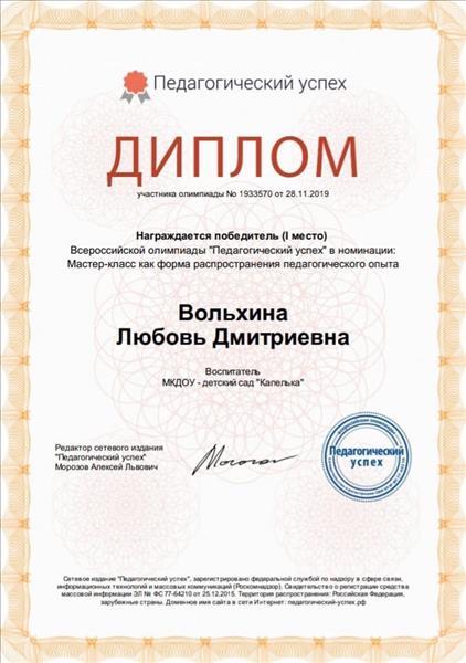| Диплом 1 место во Всероссийской олимпиаде "Педагогический успех" Мастер-класс как форма распространения педагогического опыта., 2019г. |