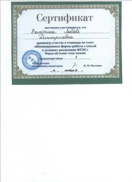 | Сертификат участника семинара "Инновационные формы работы с семьей в условиях реализации ФГОС",2019г. |