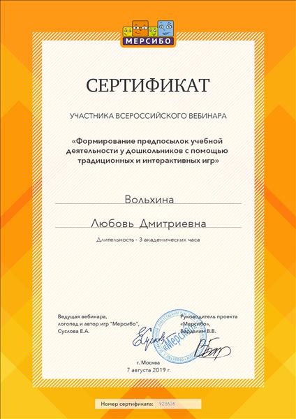 | Сертификат участника всероссийского вебинара "Формирование предпосылок учебной деятельности у дошкольников с помощью традиционных и интерактивных игр",2019г. |