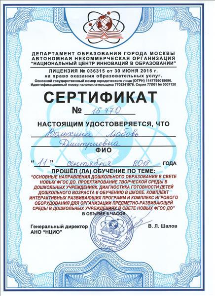 | Сертификат о пройденном обучении по теме "Основные направления дошкольного образования в свете новых ФГОС ДО",2018г. |